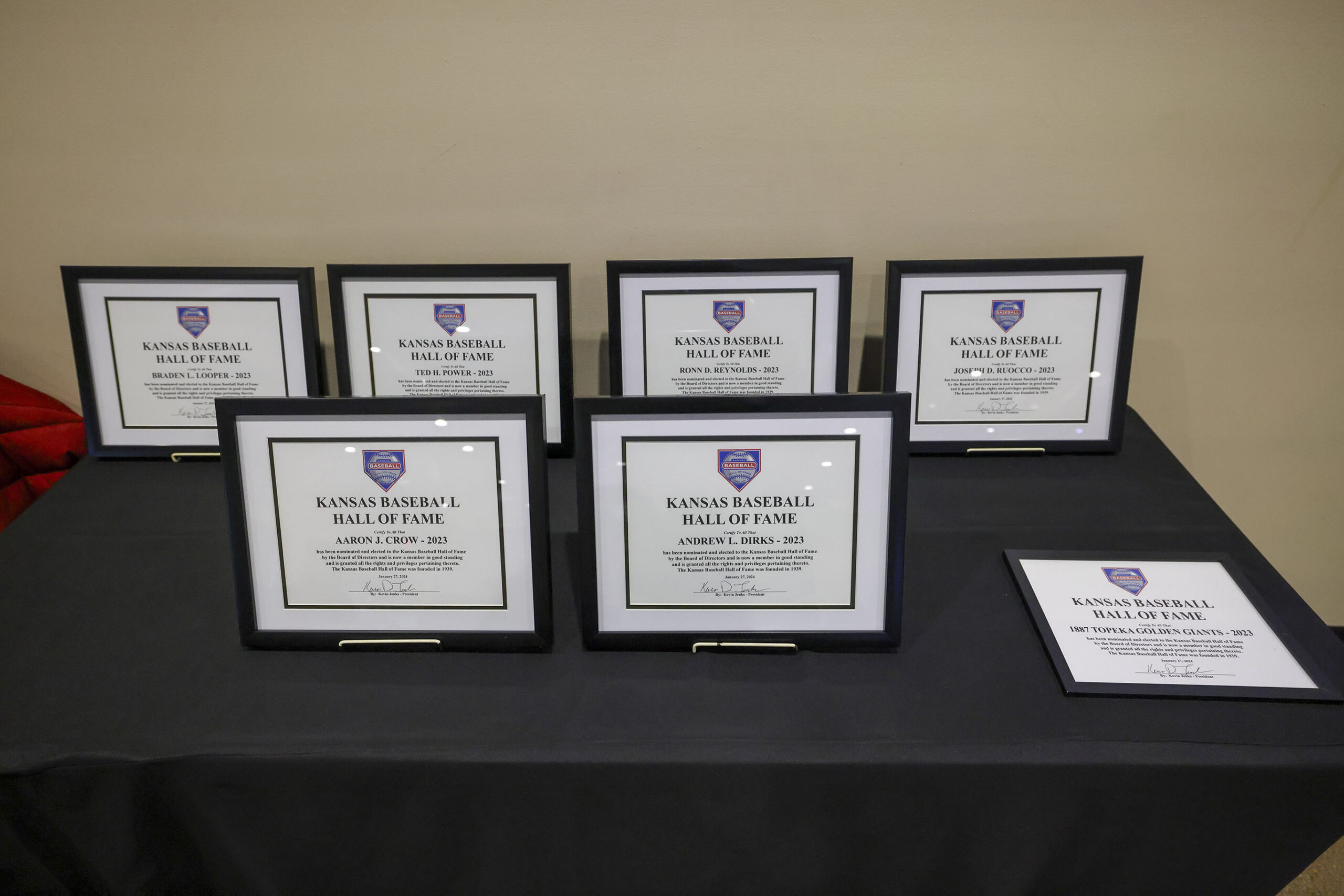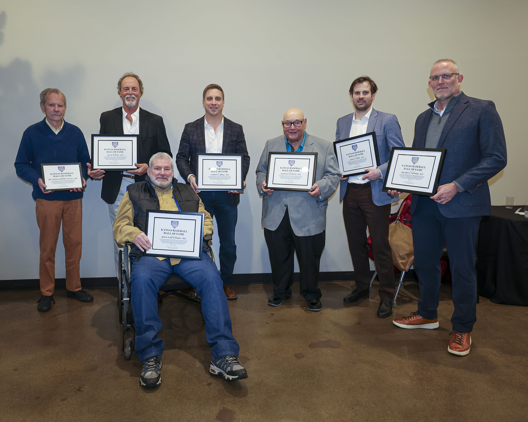 2024 Banquet (2023 Inductees): Aaron Crow, Andy Dirks, Braden Looper, Ted Power, Ronn Reynolds, Joe Ruocco, 1887 Topeka Golden Giants